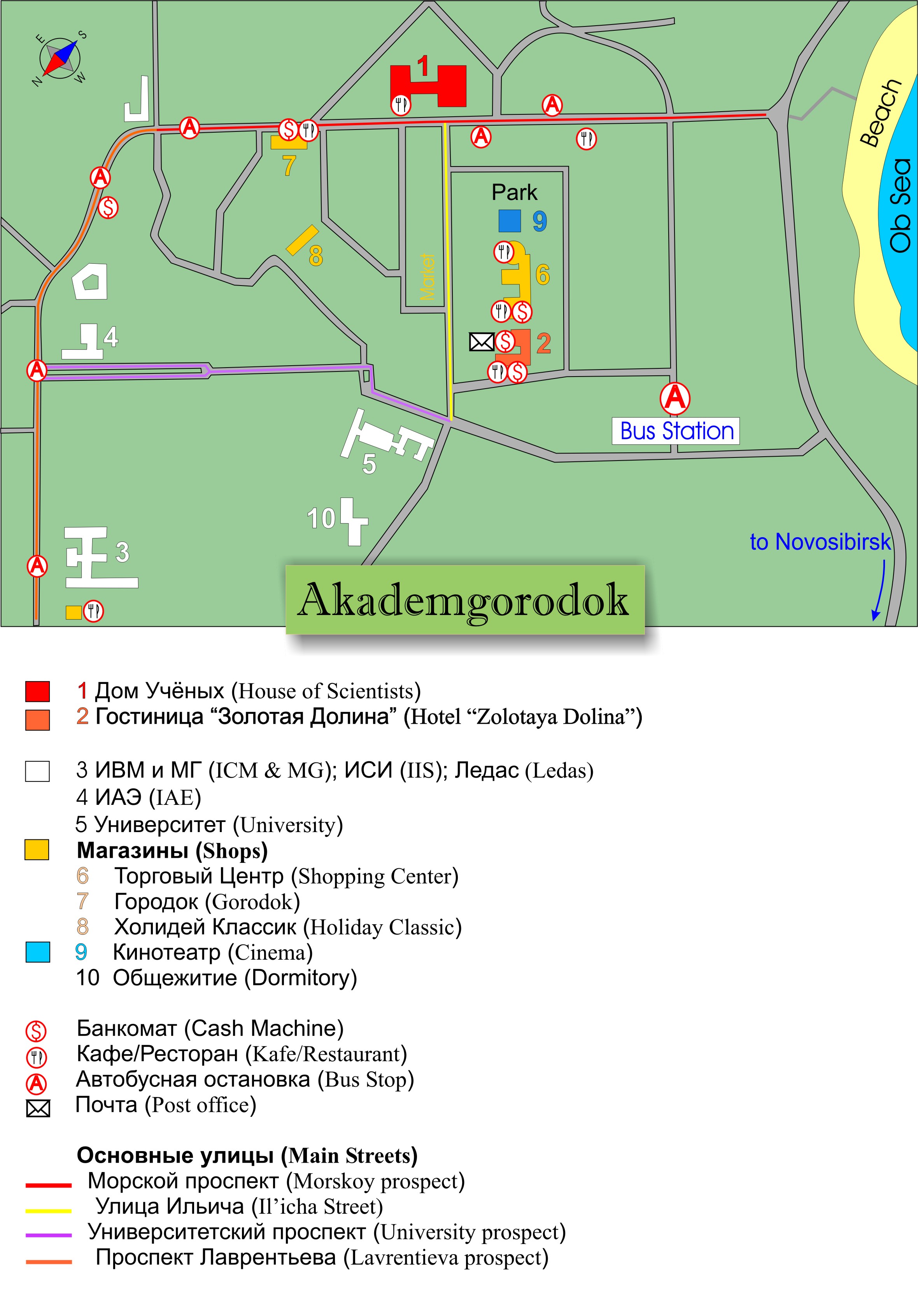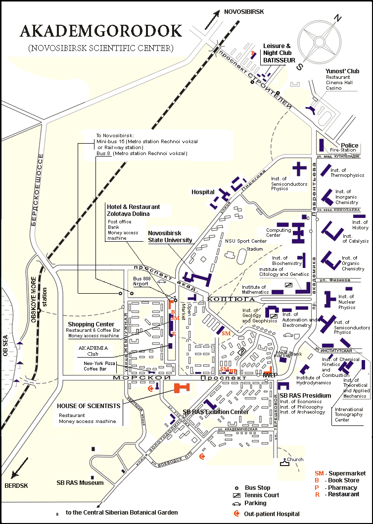 Residential areas are strategically located near the research institutes, allowing scientists and their families to live close to their workplaces. These areas are characterized by a mix of apartment buildings, often of varying heights, and green spaces. The map highlights the importance placed on creating a comfortable and livable environment, with parks, forests, and the Ob Sea (a large reservoir) readily accessible.