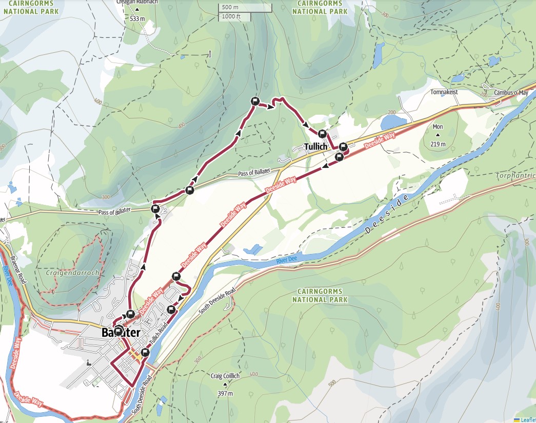 At the eastern edge of the map, you’ll find the prominent Victoria Bridge, a vital link connecting Ballater to the south side of the River Dee. Crossing the bridge brings you into the scenic countryside and towards the Cairngorms National Park. The River Dee itself is a defining feature of the map, snaking its way along the southern edge of the village. Its presence offers opportunities for salmon fishing and picturesque riverside walks.