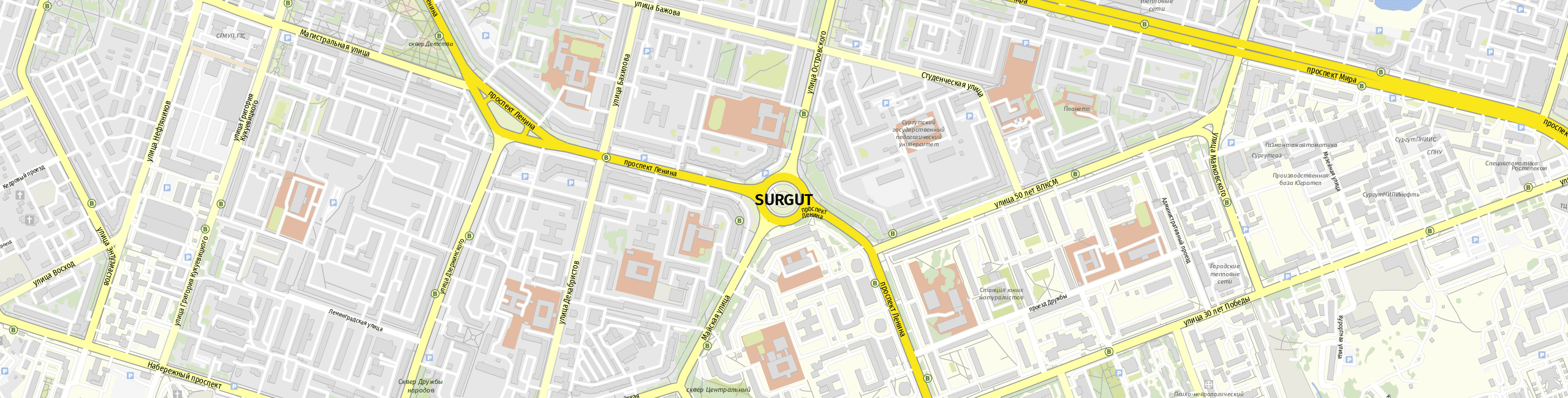 Key infrastructure points include Surgut International Airport (Аэропорт Сургут), located northeast of the city, and the Surgut Railway Station (Железнодорожный вокзал Сургут), providing connections to other cities in Russia.